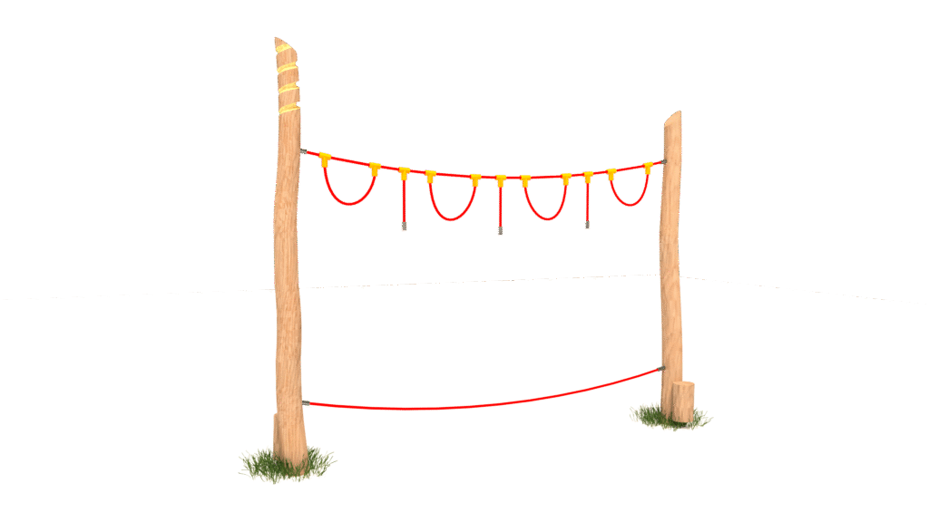 Lanový prvek SCANDY je moderní balanční překážka tvořená napnutými lany mezi dvěma akátovými sloupy. Kombinuje horní jistící lano s dolním lanem pro chůzi, mezi nimiž jsou zavěšené svislé lana, které dětem pomáhají udržet stabilitu. Tento prvek je ideální pro rozvoj koordinace a rovnováhy a skvěle zapadne do každého přírodního nebo školního hřiště.