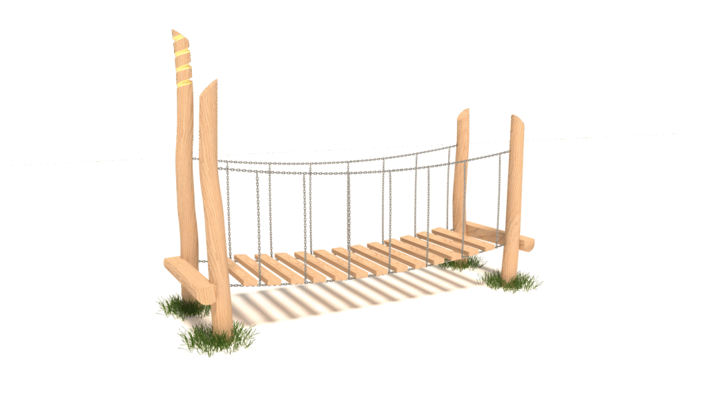 Lanový mostek PONTA II představuje klasickou balanční atrakci s pochozí částí tvořenou akátovými fošnami zavěšenými na nerezových řetězech. Je upevněn mezi dva akátové sloupy, které zajišťují stabilitu a přírodní vzhled celého prvku. Horní madla z řetězů poskytují oporu při přechodu, a tím zvyšují bezpečnost dětí. Mostek je ideální pro trénink rovnováhy a koordinace v přírodních hřištích.