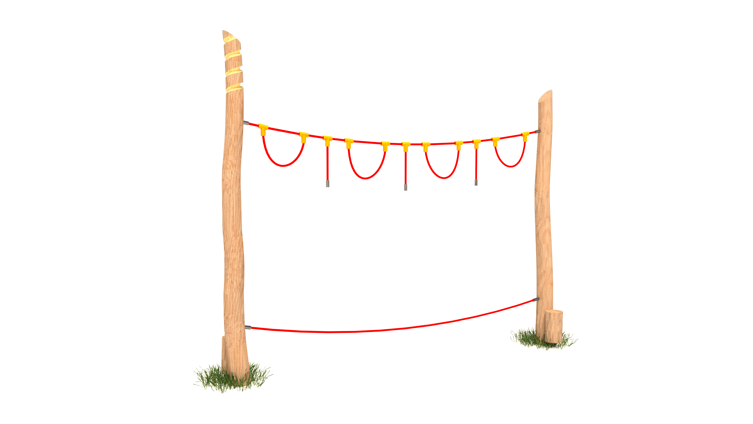 Lanový prvek SCANDY je moderní balanční překážka tvořená napnutými lany mezi dvěma akátovými sloupy. Kombinuje horní jistící lano s dolním lanem pro chůzi, mezi nimiž jsou zavěšené svislé lana, které dětem pomáhají udržet stabilitu. Tento prvek je ideální pro rozvoj koordinace a rovnováhy a skvěle zapadne do každého přírodního nebo školního hřiště.