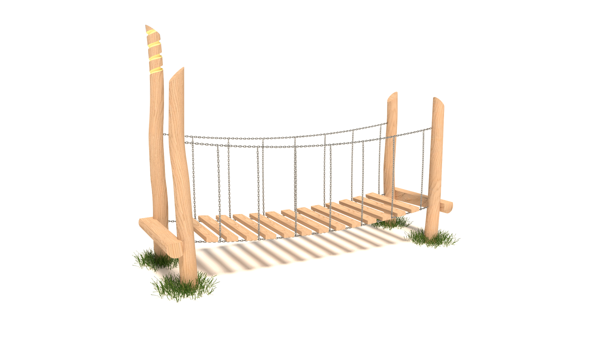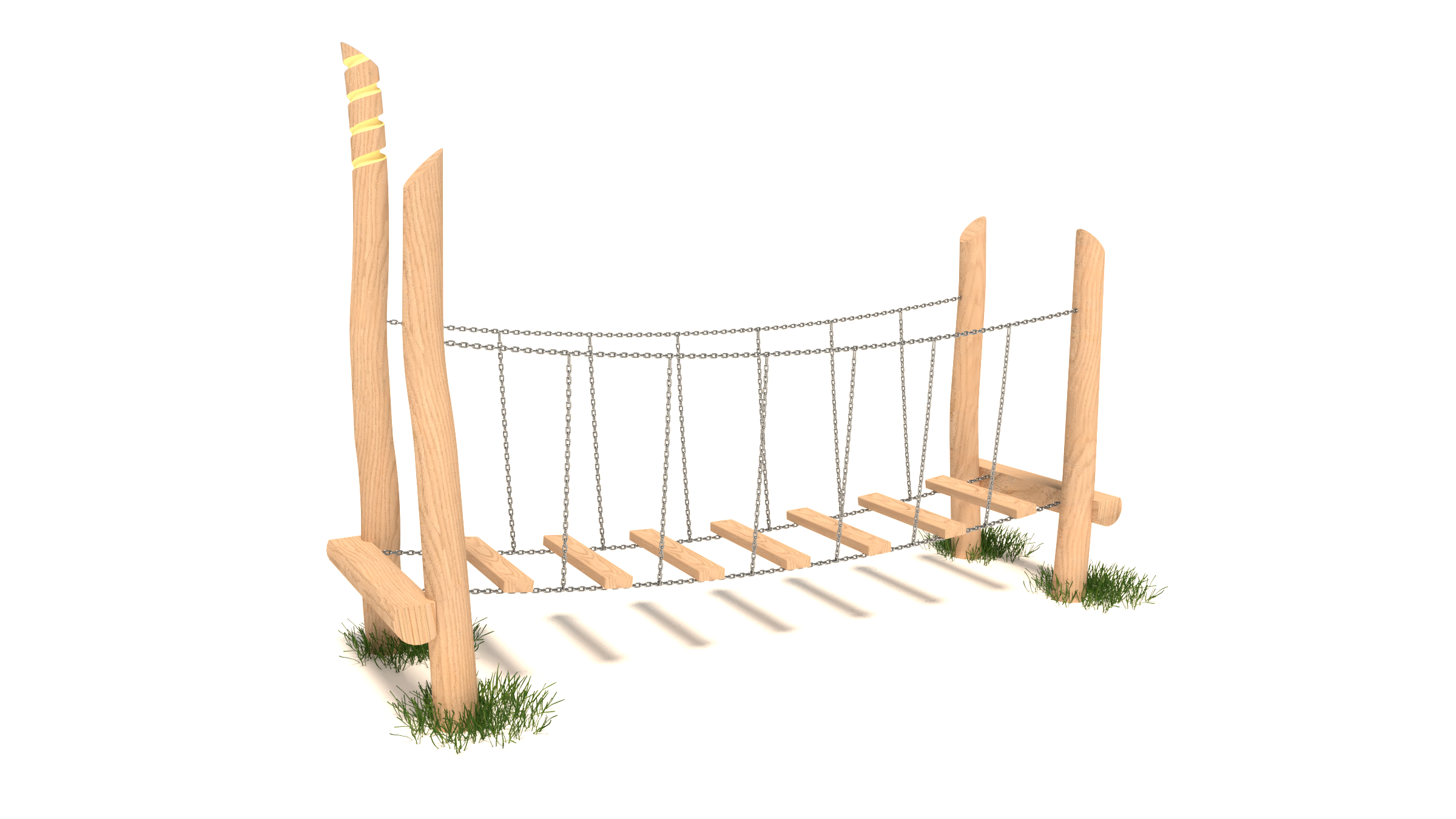 Lanový mostek PONTA II představuje klasickou balanční atrakci s pochozí částí tvořenou akátovými fošnami zavěšenými na nerezových řetězech. Je upevněn mezi dva akátové sloupy, které zajišťují stabilitu a přírodní vzhled celého prvku. Horní madla z řetězů poskytují oporu při přechodu, a tím zvyšují bezpečnost dětí. Mostek je ideální pro trénink rovnováhy a koordinace v přírodních hřištích.
